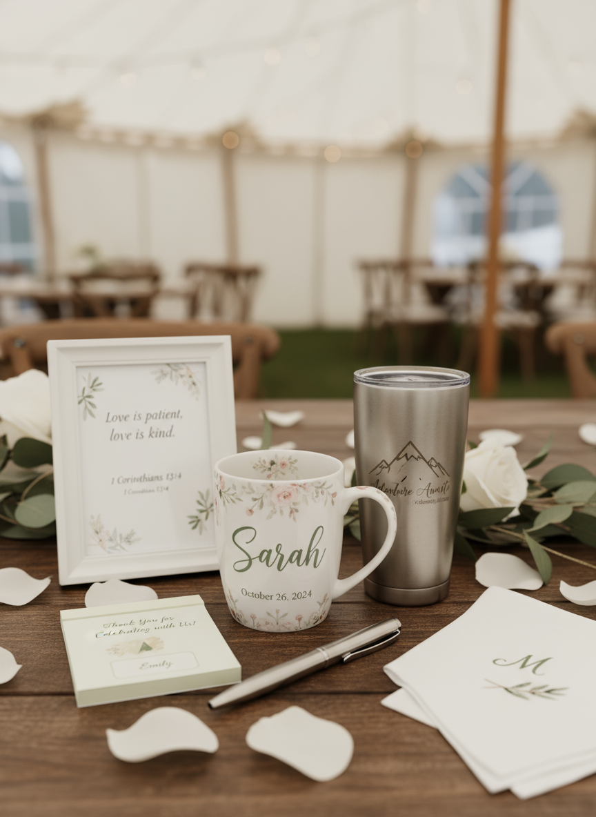 Personalized favors are a thoughtful way to thank wedding guests or add a unique touch to any special event. Personalized items like candles, coasters, mini jars of honey or jam can feature your names and date. Keepsakes, such as engraved key-chains, bottle openers, or photo magnets, are items guests can cherish long after the celebration. For a more playful twist, mints, candies or seed packets that match your theme are also meaningful choices. No matter the style, personalized favors add warmth, and make your guests feel truly appreciated.