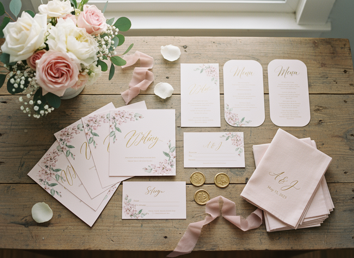 We can design custom invitations, save the dates and RSVP cards to help you prepare for your special day, whether it be a wedding, anniversary, shower or birthday celebration. We also can create elegant personalized programs, custom songbooks, pretty table numbers, menus, place cards, and thank yous, all beautifully coordinated to match your event’s colors or theme. We also have good pricing on custom napkins, table covers & runners and can provide floral arrangements to complete your day.